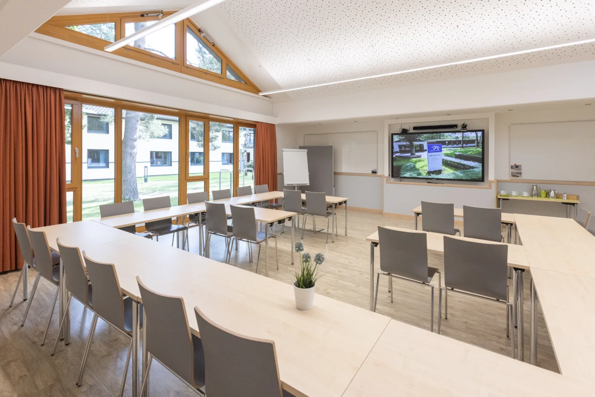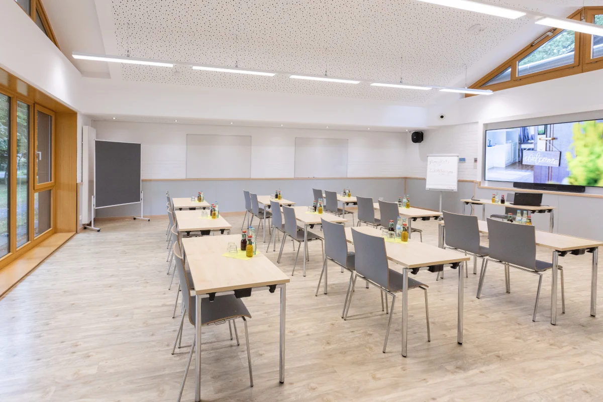 - Die Seminarräume 1 und 2 mit einer Größe von je ca. 80 qm sind für jeweils 40 Personen ausgestattet und können durch Öffnen einer Trennwand für Großveranstaltungen verbunden werden.